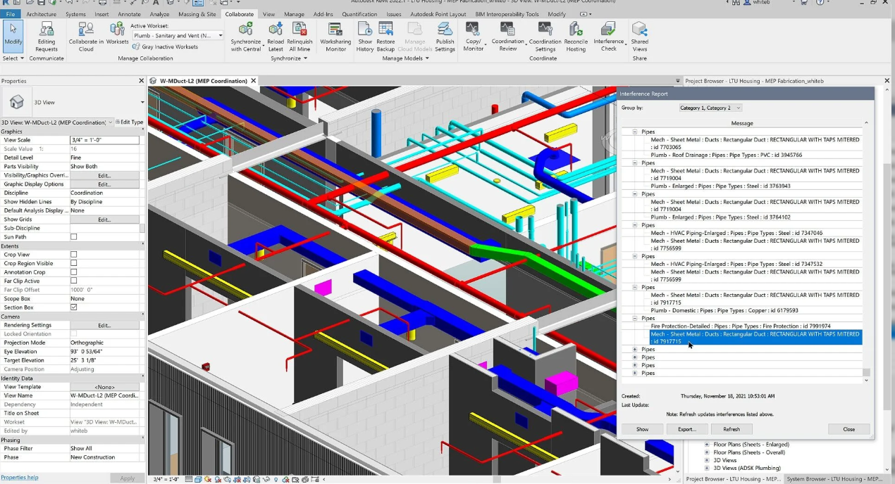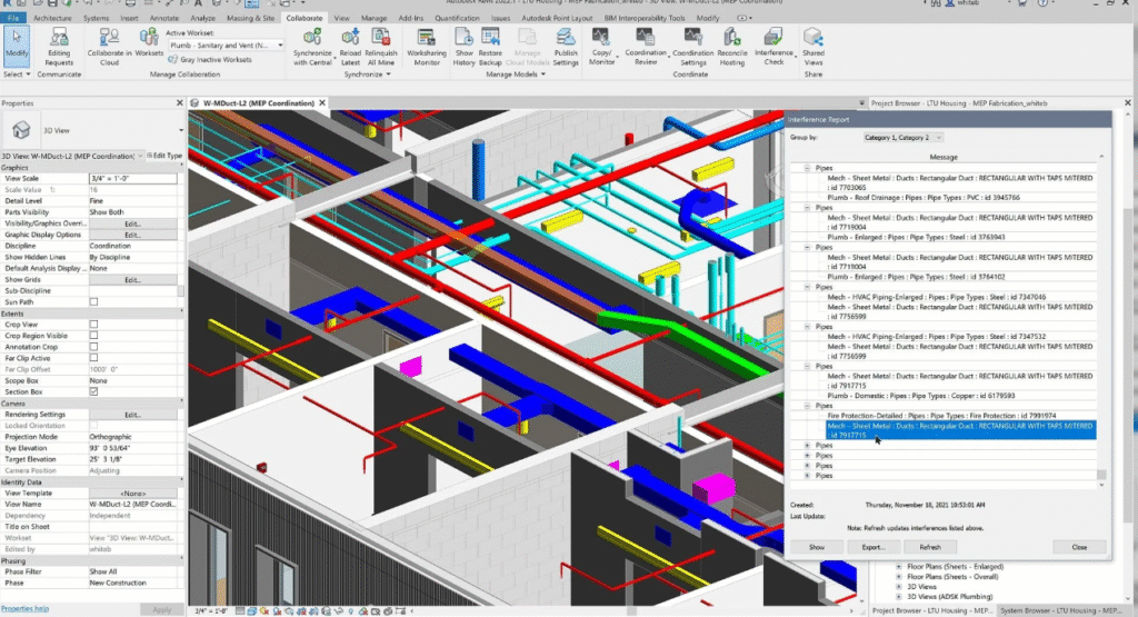 5. Coordination and Collaboration: Essential for MEP coordination, this module focuses on clash detection using Navisworks integration, worksets, and shared parameters.
